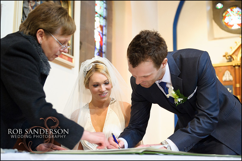 The unexpected snow last weekend threatened to cause havoc on the roads so along with my camera’s I also packed walking boots, a shovel and bag of rock salt and was pleased not to need them. I arrived at Middleton Lodge to meet up with Madeline and the girls for her bridal preparations, to find an extremely excited bride. Smiles all round and thumbs up were the order of the day. Once Madeline was in here gorgeous Jenny Packham wedding gown I had time to take a few bridal portraits before heading off to meet Jarlath and their guests at St Joseph of St Francis Xavier Roman Catholic church in Richmond.
